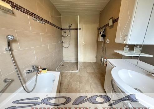 - Tageslichtbadezimmer mit Dusche, Eckbadewanne, Waschbecken und einem Fenster