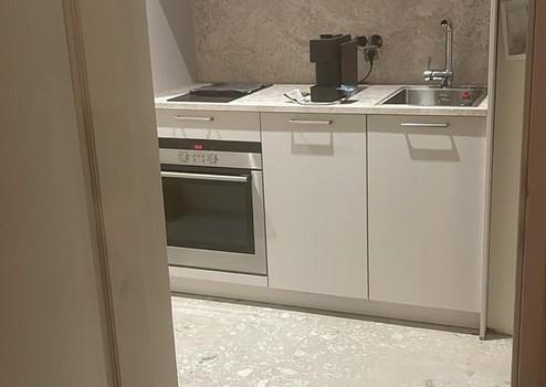 Exklusive Häcker Einbauküche mit Backofen und Spülmaschine, Waschmaschine, IKEA Waschtisch mit Unterschrank, Regendusche