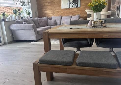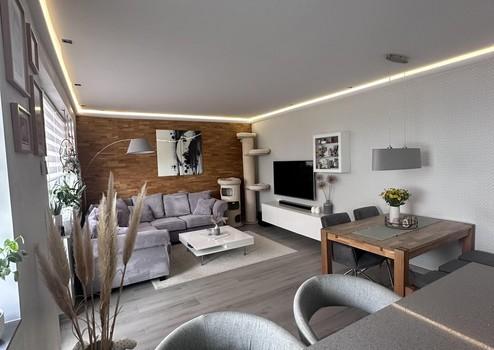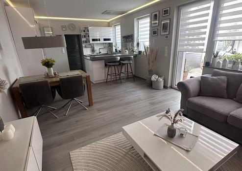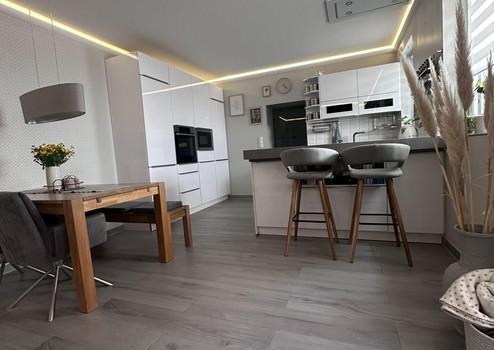 - Offene Wohn-Essküche mit exklusiver Nolte-Einbauküche (weiß) und Steinarbeitsplatte