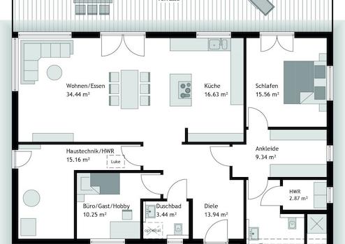 Entdecken Sie Ihren Traum-Bungalow, individuell projektiert nach Ihren Wünschen in Hannover/ Seelhorst. Dieser stilvolle Bungalow bietet mit 134,81 m² Wohnfläche und 4 Zimmern ausreichend Platz für Ihre Familie. Die durchdachte Raumaufteilung umfasst 4 Schlafzimmer, ein modernes Badezimmer mit Dusche, Wanne und Fenster sowie ein zusätzliches Gäste-WC. Genießen Sie die Vorteile der offenen Raumgestaltung und der effizienten Nutzung des Grundstücks von 542 m². Die Bauweise entspricht dem KFW40 Standard und sorgt somit für besonders niedrige Energiekosten. Mit einer Wärmepumpe als Befeuerungsart investieren Sie in eine nachhaltige Heiztechnologie, die nicht nur umweltfreundlich ist, sondern auch Ihre Energiekosten spürbar senkt. Diese individuelle Planung und Ausführung ermöglicht es Ihnen, Ihr Zuhause nach Ihren Vorstellungen zu gestalten und gleichzeitig von den Vorteilen der Fertighausbauweise zu profitieren.
