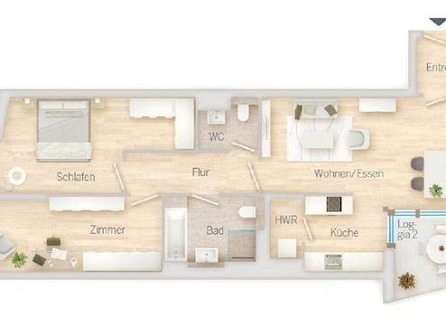 In dieser 3-Zimmer-Wohnung haben Sie gleich zwei Sonnenplätze. Die Süd-Loggia, die mit einer vollflächigen Fensterfront an den Wohn-/Essbereich angrenzt, bietet Ihnen Sonne ab den frühen Mittagsstunden. Ab dem späten Nachmittag bis in die Abendstunden können Sie die Sonne auf der West-Loggia genießen, die an eines der westlichen Zimmer angrenzt. Die Wohnung verfügt über einen großzügigen Wohn-/Essbereich, ein Schlafzimmer mit guter Stellmöglichkeit für Ihre Kleiderschränke und ein weiteres Zimmer, das als Arbeits-, Gäste- oder Kinderzimmer genutzt werden kann.