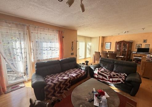 - großer Wohn- und Essbereich mit Parkettboden, Zugang zur Terrasse und zusätzlichem angebautem Wintergarten