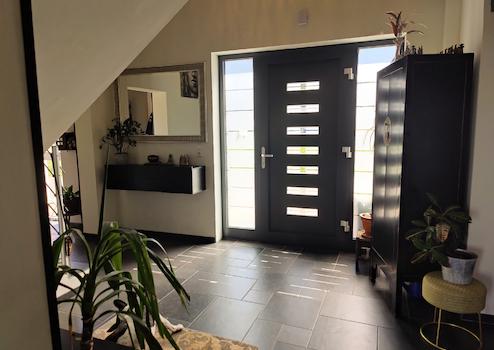 Das Haus verfügt über hochwertige Kunststofffenster mit Isolierverglasung. Diese sind, wie auch die Eingangstür, von außen farbig gestaltet.