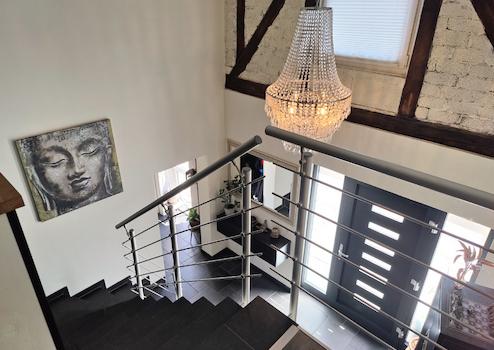 Die Doppelhaushälfte verfügt über ca. 188 m² Wohnfläche. Das Erdgeschoss ist offen gestaltet und bietet teilweise unverputzte Betondecken im Industrial Style. Auch der Rest des Hauses wurde geschmackvoll und modern hergerichtet. Vom Wohn- bzw. Esszimmer gelangt man auf eine riesige Außenterrasse und in den liebevoll angelegten Garten mit Gartenteich. Die Diele bietet einen freien Blick in die Galerie im OG. Beim Umbau wurde auf eine energieeffiziente Gestaltung geachtet. So wurden z.B. die Außenwände im EG mit einer zweiten Mauer und im EG und OG mit einer zusätzlichen Außendämmung versehen. Im Dach wurde der Dachboden gedämmt.