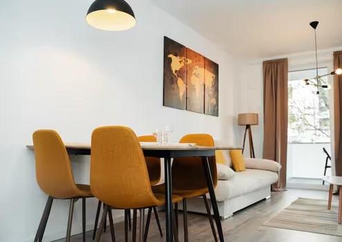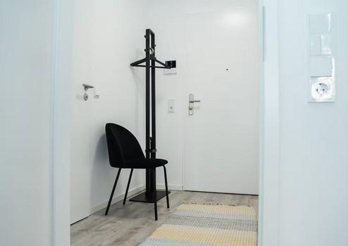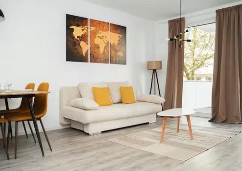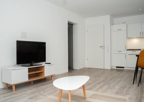 Die Wohnung ist stilvoll und hochwertig möbliert – inklusive einer modernen Einbauküche. Der offene Wohn- und Essbereich lädt zum Wohlfühlen ein, während das Schlafzimmer als ruhiger Rückzugsort überzeugt.