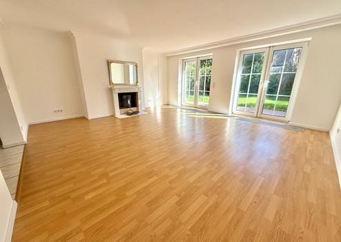 Das offene und lichtdurchflutete Wohnzimmer beeindruckt durch seine weitläufige Raumwirkung, bodentiefe Fenster und einem stilvollen Kaminbereich, der für besondere Abende und Wohnmomente sorgt. Direkt vom Wohnzimmer finden Sie Zugang zum wunderschön angelegten Garten mit einem gepflasterten Terrassenbereich. Ein Ort für Ruhe, Familienleben und entspannte Sommerabende. Die abgetrennte Küche mit Bartheke verbindet sich harmonisch mit dem Essbereich - perfekt für kommunikatives Kochen und gesellige Abende. Ein Gäste-WC rundet das Erdgeschoss ab.
