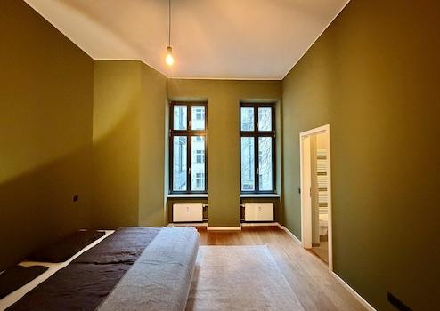 Die Wohnung verfügt über glattgeputze Wände mit hohen Decken, Ziegelwände sowie über Echtholz-Dielendoden. Die Isolierfenster (teilweise bodentief) befinden sich aus Echtholz. Die Bäder sind mit großformatigen Feinsteinzeug-Fliesen sowie mit Armaturen und Sanitärartikeln deutscher Herstellermarken ausgestattet. Diese Wohnung ist außergewöhlich ruhig im Hinterhaus, fern ab des Strassenlärms gelegen.
