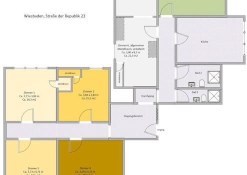 Fünf separate Zimmer in zwei Flügeln, eine helle, großzügige Küche mit großem Essplatz als gemeinsamer Treffpunkt und zwei Bäder sorgen für ausreichend Platz. Alle Räume sind über einen großzügigen Flur verbunden, was für ein angenehmes Raumgefühl sorgt.