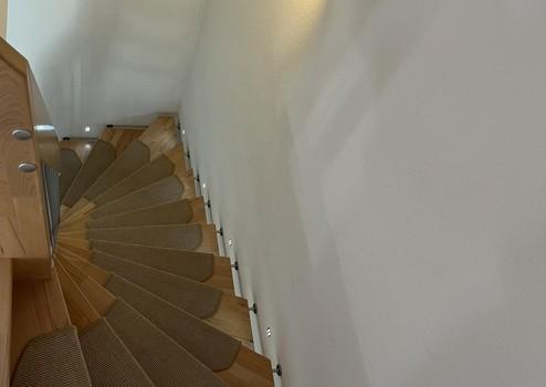 Über eine mit LEDs beleuchtete Treppe erreichen Sie das Obergeschoss. Dort befindet sich ein Bad mit Fußbodenheizung und Handtuchheizkörper, Badewanne und großzügiger, ebenerdiger Regendusche. Diese ist mit außergewöhnlichen, fugenfreien Acrylwänden versehen.
