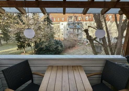 Der überdachte Balkon erweitert den Wohnraum nach außen und schafft einen geschützten Ort der Entspannung.