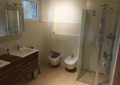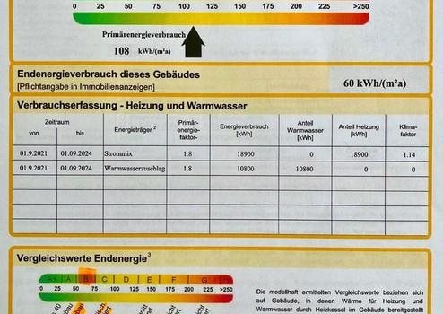 NACHHALTIGKEIT. Das ganze Haus wird sehr umweltfreundlich durch zwei Wärmepumpen mit Heizungswärme und Warmwasser versorgt und die Wohnungsdecke wurde auf dem Dachboden vorbildlich gedämmt. Laut Energieausweis ist es mit nur 60 kWh/(m2a) in die Kategorie B ("energetisch gut modernisiert") eingestuft, welches sich an den niedrigen Heizungskosten widerspiegelt. Die Photovoltaikanlage auf dem Dach erzeugt mehr Strom, als das ganze Haus pro Jahr benötigt und ist auch bei Stromausfall durch ihre Schwarzstartfähigkeit benutzbar, welches dem Mieter ein besonderes gutes und sicheres Gefühl vermitteln kann.