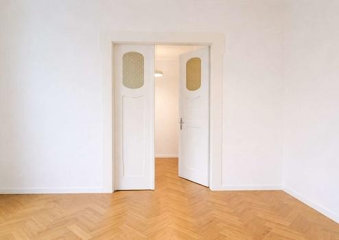 In den Wohnräumen sind hochwertige Echtholz-Parkettböden im klassischen Fischgrätmuster verlegt. In den Fluren befindet sich Laminatboden, während Küche und Bad mit Fliesen ausgestattet sind.