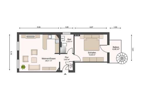 Auf rund 60 m² Wohnfläche bietet die Wohnung eine durchdachte Raumaufteilung mit großzügigem Wohnbereich und offener Küche, einem ruhig zum begrünten Innenhof gelegenen Schlafzimmer mit Balkonzugang sowie einem Tageslichtbad mit Dusche. Der Balkon zum Innenhof erhöht die Attraktivität für Mieter zusätzlich.