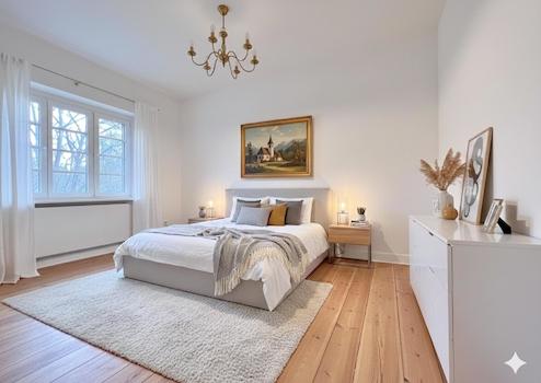 Die helle, freundliche Atmosphäre mit hohen Decken sowie die ruhige Lage schaffen einen Rückzugsort, der Entspannung garantiert. Besonderen Flair vermitteln der hochwertige Dielenboden und die stilvoll verzierten Türrahmen, die den Charakter des Baujahres 1929 bewahren. Praktische Extras wie eine Einbauküche und ein eigener Kellerraum runden das Angebot ab.
