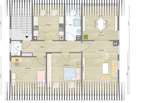 - Bodenbeläge: Parkettboden im Wohnbereich, Laminat in den Schlafzimmern