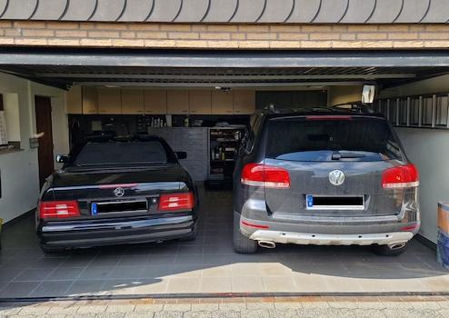 Die Doppelgarage bietet ohne weiteres Platz für zwei große Fahrzeuge und Zubehör und ist mit einem Hörmann-Garagentorantrieb sowie Warm- und Kaltwasseranschluss ausgestattet. Hier kann man sich auch hervorragend ganz privat der Fahrzeugpflege und Wartungsarbeiten an den eigenen Autos/Motorrädern widmen.