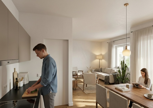 Herzstück der Wohnung ist der offene Wohn-/Essbereich: hell, freundlich und perfekt für gemeinsame Kochabende, entspanntes Ankommen nach der Arbeit oder gemütliche Stunden auf dem Sofa. Von hier aus gelangen Sie auf Ihren Balkon – ein schöner Platz für den ersten Kaffee am Morgen, frische Luft zwischendurch oder ein Glas Wein am Abend.