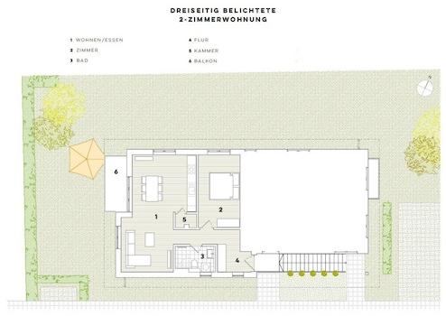 Ausstattung der 2-Zimmerwohnungen: Fußbodenheizung, Flur mit Platz für Garderobe, offener Wohn-/Essbereich, Balkon, separater Abstellraum, Tageslichtbad mit bodengleicher Dusche.