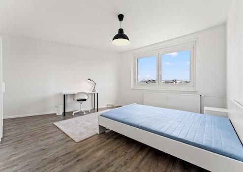 Three rooms, one of it available with almost 19 m² are fully furnished with brand-new, unused pieces—bed with fresh linens, wardrobe, desk, chair and lighting. The 2025 fitted kitchen provides a stove/oven, large refrigerator, crockery and cookware; the modern tiled bathroom offers a bathtub and a new washing machine. All rooms lead off a central hallway, so every resident enjoys plenty of privacy, each with their own key.