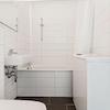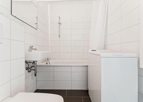 Modern gefliestes Bad mit Badewanne und neuer Waschmaschine