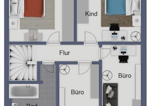 Das Obergeschoss beherbergt die privaten Rückzugsräume. Neben dem Schlafzimmer stehen weitere Zimmer zur Verfügung, die sich flexibel als Kinder-, Gäste- oder Arbeitszimmer nutzen lassen. Ein Badezimmer mit Badewanne ergänzt diese Etage. Die vorhandene Treppenanlage wird durch einen installierten Treppenlift.