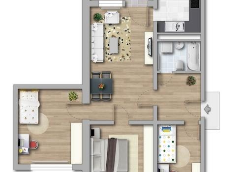 Die Wohnung befindet sich im 4. OG eines Mehrfamilienhauses für Singles, Paare und Familien. Das Objekt verfügt über keinen Aufzug.