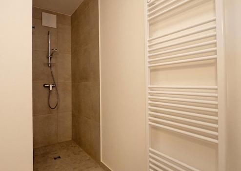 Beim Betreten der Wohnung empfängt Sie ein einladender Flur, der rechts direkt in den lichtdurchfluteten Wohnbereich führt. Links erwartet Sie das stilvolle Duschbad, ausgestattet mit hochwertigen Materialien und einer ebenerdigen Dusche. Nebenan liegt das Schlafzimmer, das mit großen Fenstern und einer ruhigen Atmosphäre besticht – ein idealer Rückzugsort.