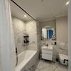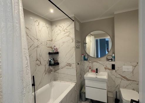 Die beiden exklusiv ausgestatteten Badezimmer überzeugen mit vollflächiger Verfliesung in edler Marmoroptik, stilvollen schwarzen Armaturen, einer bodengleichen Regendusche, einer integrierten Hygienedusche sowie einer hochwertigen Badewanne im zweiten Bad – ein privater Wellnessbereich für jeden Tag.