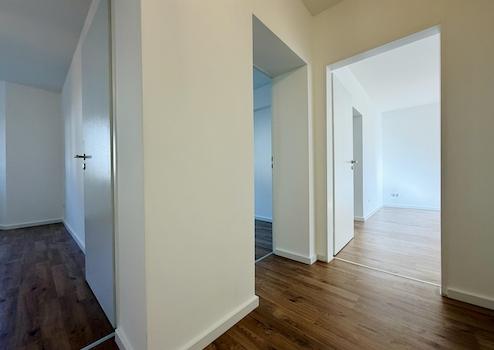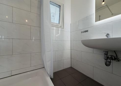 Vollständige Renovierung: neuer Boden (Holzdekor) mit weißen Holzfußleisten, neue weiße Innentüren mit Edelstahlgriffen, frisch gestrichene Wände durchgehend in Weiß. Großformatige Fliesen in Marmoroptik, beleuchteter Spiegel, Handtuchheizkörper. Separates WC mit Fenster und weißen Wandfliesen. Alle Zimmer mit Heizkörpern und ausreichend Steckdosen. Balkon vorhanden. Kellerabteil im Gebäude inklusive.