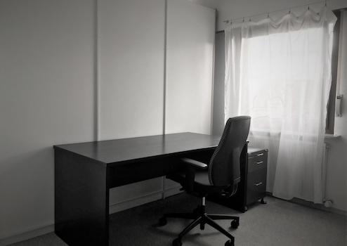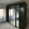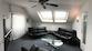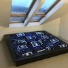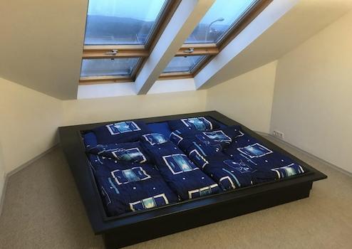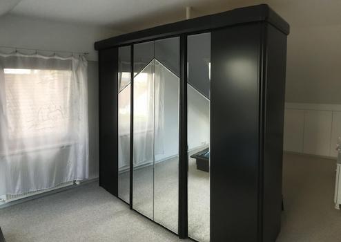 Fantastisches Futon Bett 200x200cm, direkt unter Dachfenster. Bettwäsche, Decke (zwei Stück 220x140cm) und Kissen. Ein großer Spiegelschrank fungiert als Raumteiler zum Bürobereich. Schreibtisch, Rollcontainer und Bürosessel.