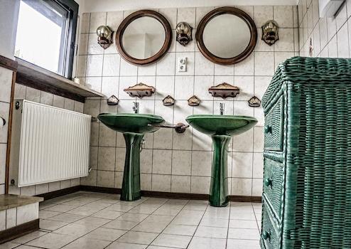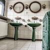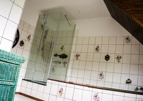 Wellness-Bad: Helles Tageslichtbad mit zwei Waschbecken, Wanne und Dusche mit Echtglasduschkabine. Ausgestattet mit wassersparenden Armaturen; Warmwasser über modernen Durchlauferhitzer (DLE).