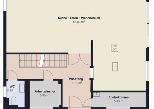 EG: Eingangsbereich, offener Wohn/Essbereich und Küche, Gäste WC, Speise/Abstellkammer und Büro