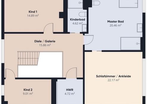 OG: Schlafzimmer+Bad ensuite, separates Bad (Dusche), Kinderzimmer, Büro/Gästezimmer und Hauswirtschaftsraum