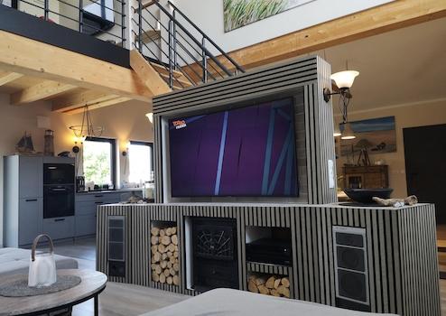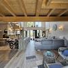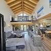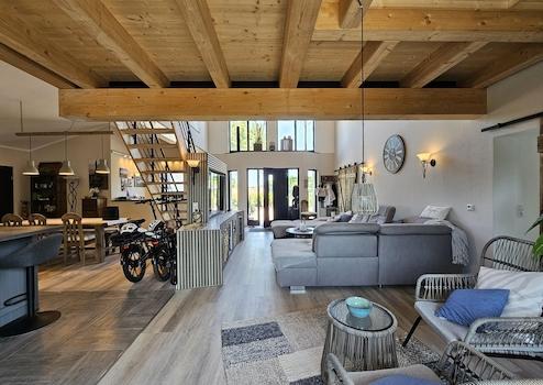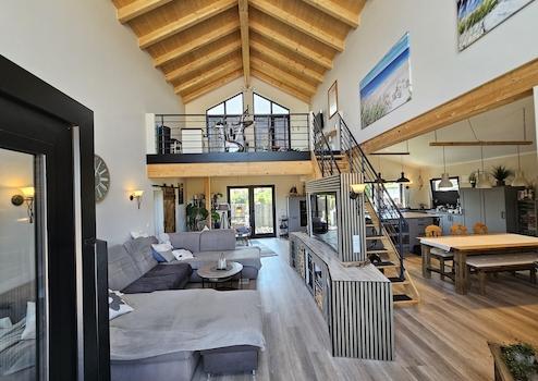 Der offen gestaltete Wohnbereich mit ca. 7 m Raumhöhe auf rund 100 m² vermittelt ein außergewöhnliches Raumgefühl. Die beeindruckende Giebelverglasung und großzügige Fensterflächen durchfluten den Raum mit Tageslicht und schaffen eine harmonische Verbindung zwischen Innen- und Außenbereich.