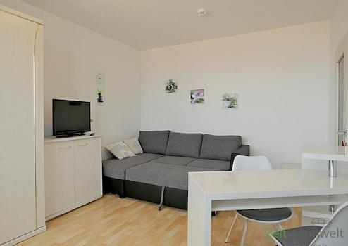 ### Please note the availability date! Bitte das Verfügbarkeitsdatum beachten! ### möbliertes Apartment in DD-Mickten; Wohnraum mit Bett, Kleiderschrank, Sessel, TV und Schreibtisch; Küchennische mit Esstisch; Bad mit ...