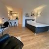 ### Please note the availability date! Bitte das Verfügbarkeitsdatum beachten! ### möbliertes Apartment in DD-Mickten; Wohnraum mit Bett, Kleiderschrank, Sessel, TV und Schreibtisch; Küchennische mit Esstisch; Bad mit ...