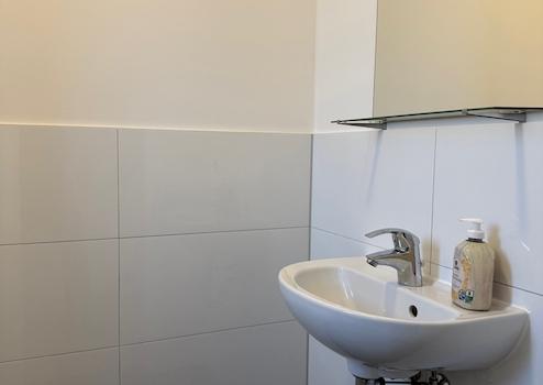 Das Gäste-WC im Erdgeschoss und das Badezimmer im Obergeschoss sind hell gefliest.