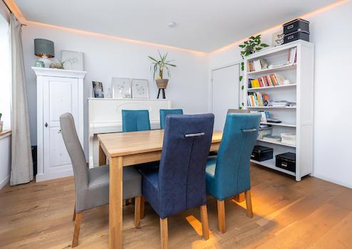 Im Erdgeschoss erwartet Sie ein gemütlicher Wohnbereich mit Kamin, der zu gemütlichen Abenden mit Familie und Freunden einlädt. Von hier aus gelangen Sie direkt in den dreiteiligen Gartenbereich, bestehend aus einer Holzterrasse mit Pavillon und Hochbeet, einer Rasenfläche sowie Staudenbeeten – ideal zum Entspannen, für gesellige Sommerabende oder den ersten Kaffee am Morgen. Die funktional und geschmackvoll ausgestattete Küche bietet ideale Voraussetzungen für den Alltag sowie für alle, die gerne kochen. Eine Modernisierung, insbesondere der Elektrogeräte, erfolgte zuletzt im Jahr 2021. Hochwertige Eichendielen und elegante Granitböden ziehen sich durch das gesamte Haus und sorgen für ein stilvolles Wohnambiente.