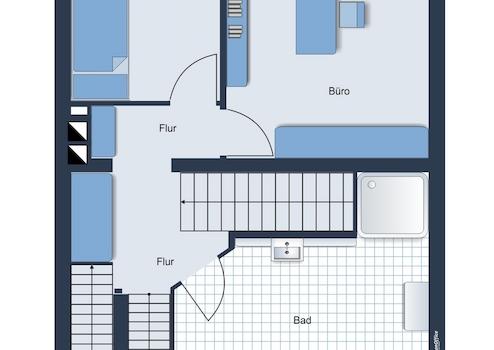 Das erste Obergeschoss bietet zwei vielseitig nutzbare Zimmer, die sich ideal als Schlaf-, Kinder- oder Arbeitszimmer eignen. Das voll ausgestattete Badezimmer überzeugt mit Badewanne, Regendusche sowie edlen Granitfliesen und lässt keine Wünsche offen.