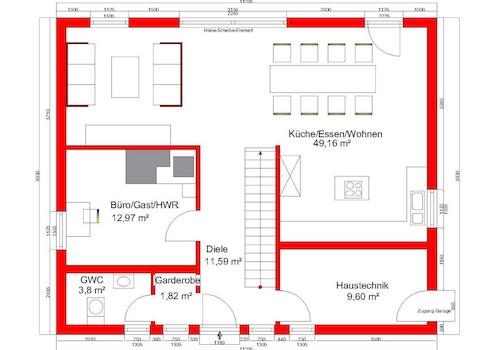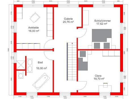 Im Erdgeschoss bildet der offen gestaltete Wohn-, Ess- und Kochbereich mit 49 m² das Herzstück des Hauses. Der gesamte Wohnbereich wird von drei Seiten mit Tageslicht durchflutet. Die Küche ist über Eck angeordnet, so kann sie nicht direkt vom Flur oder vom Wohnbereich aus eingesehen werden. Weiterhin befinden sich ein optionales Duschbad, ein Haustechnik-/Hauswirtschaftsraum, eine schöne Diele sowie ein praktisches Zusatzzimmer (Gäste/Hobby/Schlafen/Kind) im Erdgeschoss. Der Grundriss ist so konzipiert, dass auch bei Krankheit oder im Alter das Wohnen auf einer Etage möglich ist. Das Obergeschoss ist mit drei Kinderzimmern und einem Kinderbad geplant. Der Elternbereich überzeugt mit einem Ankleidebereich und einem Bad en Suite. Der Flurbereich ist als Galerie ausgestaltet.