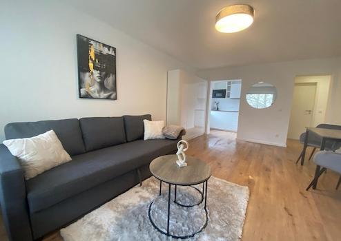 Die Wohnung ist frisch saniert, modern möbliert und lichtdurchflutet. Der geräumige Wohn- und Schlafbereich bietet Zugang zum Balkon, der zusätzlichen Wohnkomfort und einen angenehmen Rückzugsort im Freien schafft.