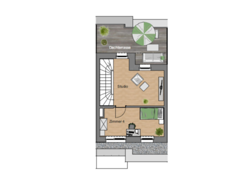 Im Dachgeschoß befindet sich ein geräumiges Studio mit Zugang auf die schöne sonnige Dachterrasse von ca. 16 m².