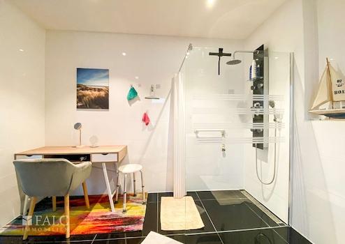 Die luxuriös ausgestatteten Badezimmer bieten zeitgemäßen Komfort: Großzügige, ebenerdige Duschen mit Glasabtrennungen unterstreichen den modernen Stil. Das Bad im ersten Obergeschoss verfügt zusätzlich über eine freistehende Badewanne – ideal für entspannte Momente. Im zweiten Obergeschoss sorgt die Kombination aus schwarz-weißen Hochglanzfliesen und ebenerdiger Dusche für ein besonders edles Ambiente.
