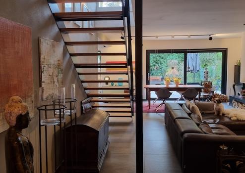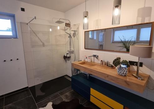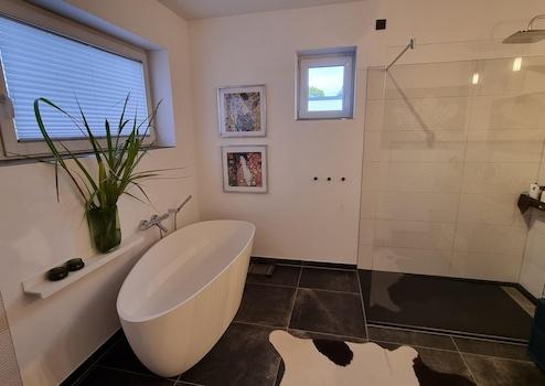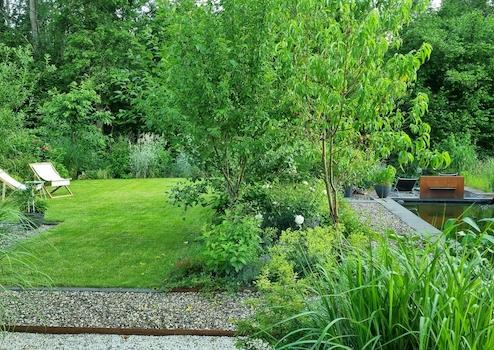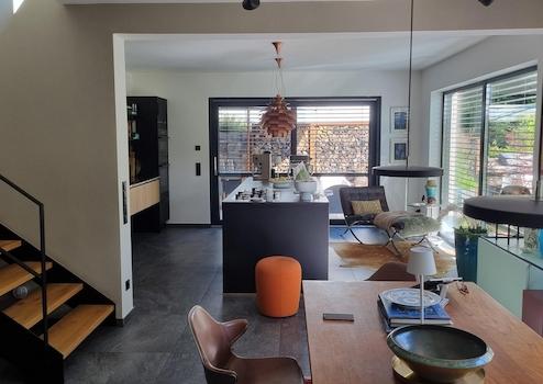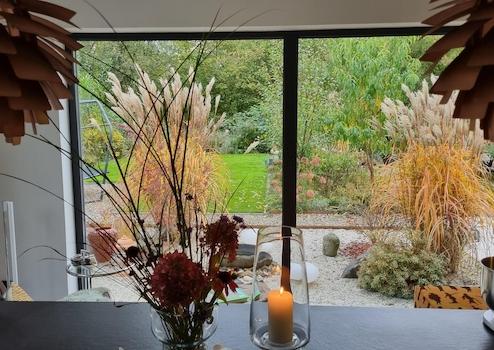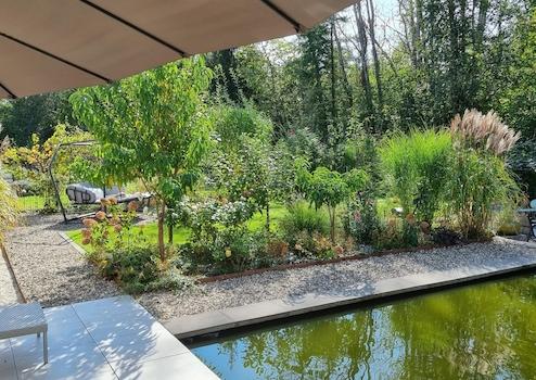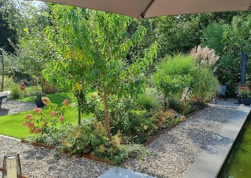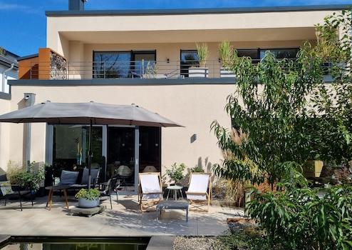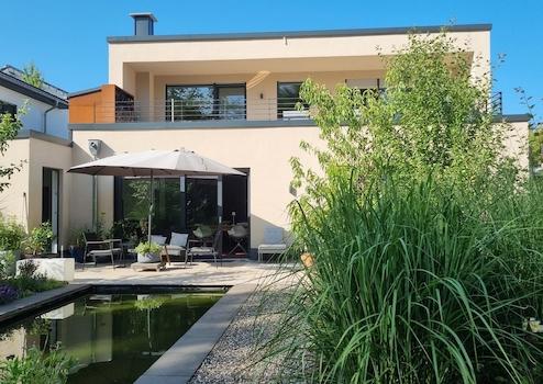 Auf ca. 196 qm Wohnfläche verteilen sich 4 helle Zimmer, die viel Platz für Familie, Homeoffice und individuelle Wohnideen bieten. Große Fensterflächen mit hochwertigen Schiebetüren im Wohnbereich sorgen für eine lichtdurchflutete Atmosphäre mit direktem Blick in den abwechslungsreich gestalteten Garten mit einem großen Gartenteich und separaten Sitzplätzen, ideal um zum Beispiel eine Feuerstelle einzurichten.