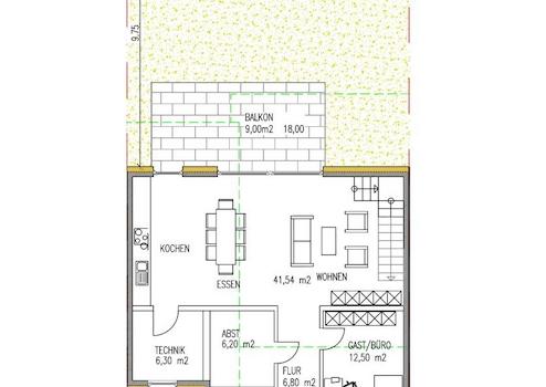 Die Planung für dieses Objekt sieht im Erdgeschoss einen großzügigen hellen Wohn/Essbereich mit offener Küche von insgesamt ca. 41 m² vor. Der Küche ist der Hauswirtschaftsbereich/Technik von ca. 6 m² zugeordnet. Aus dem Wohnraum gelangen Sie auf die attraktive Terrasse von ca. 18 m² und in den Garten. Das Erdgeschoss wird durch das Gäste-Zimmer/ Büro von ca. 13 m², das Gäste-WC sowie den Abstellraum von ca. 6 m² vervollständigt.