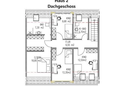 Hier befindet sich der Elternschlafbereich bestehend aus dem geräumigen Elternschlafzimmer von ca. 18 m² mit Ankleidebereich und dem zugeordneten Elternbad mit Fenster von ca. 7 m². Vom zentralen Flur gelangen Sie in zwei schöne helle Kinderzimmern von je ca. 13 m², ein weiteres Kinderzimmer/Büro von ca. 10 m² sowie das Kinderduschbad mit Fenster.