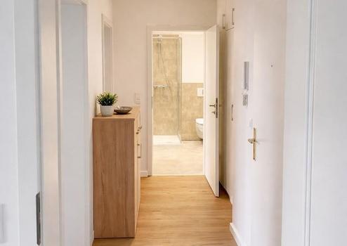 Bereits beim Betreten der Wohnung empfängt Sie ein heller Flur mit einem großen Einbauschrank, der viel Stauraum für Kleidung, Schuhe, Jacken und weitere Dinge des Alltags bietet.