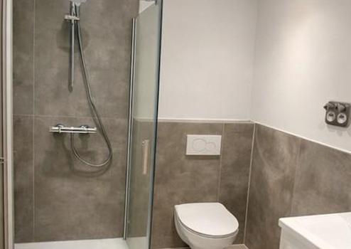 Das Badezimmer wurde vollständig erneuert und präsentiert sich modern mit Dusche, neuen Fliesen und zeitgemäßer Ausstattung.