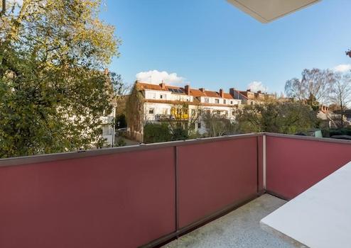• Das sonnige und lichtdurchflutete Wohnzimmer zur Rückseite des Hauses gelegen, bietet einen direkte Zugang auf den Balkon mit Blick auf den Hinterhof und in die dahinter liegenden Gärten.