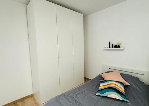 Hochwertige neue Möbel und neue Pantryküche dazu gehört eine Kühl -gefrierkombi , auch sind Töpfe , Teller unsw. vorhanden .Im Flur befindet sich ein Gaderrobenschrank .Ein 120cm breites Bett gehört zur Einrichtung , wie auch ein Fernseher und Welan.